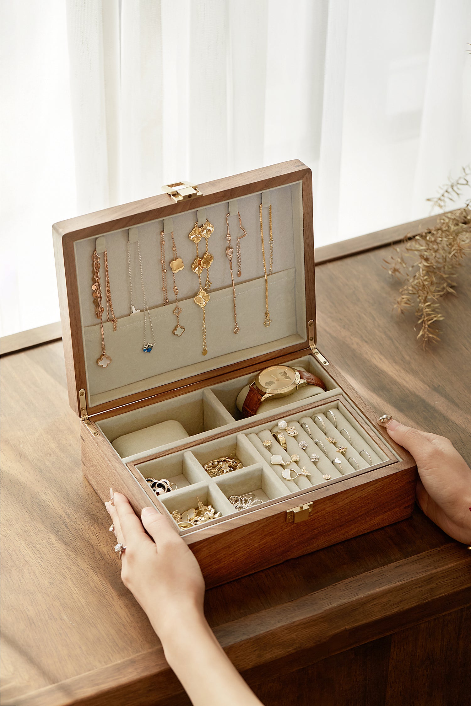 Each jewelry box is meticulously hand-polished, with a smooth surface and rounded edges for safety and aesthetics. The interior is thoughtfully designed, featuring multiple storage layers and compartments specifically for rings, necklaces, earrings, bracelets, and other jewelry. This ensures your precious pieces stay organized and easily accessible.